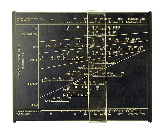 Для приблизительного определения кинематической вязкости необходимо совместить край подвижной планки с временем истечения на шкале нужного типа вискозиметра, после чего не сдвигая планку определить по верхней, либо нижней шкале кинематическую вязкость.