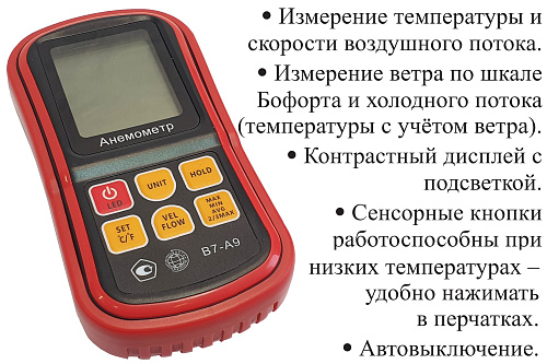 Диапазон измерения величины «холодный ветер», °С - В7-А10 (разрешение 0,1 °С, погрешность ±2 °С, время отклика 1 с) |